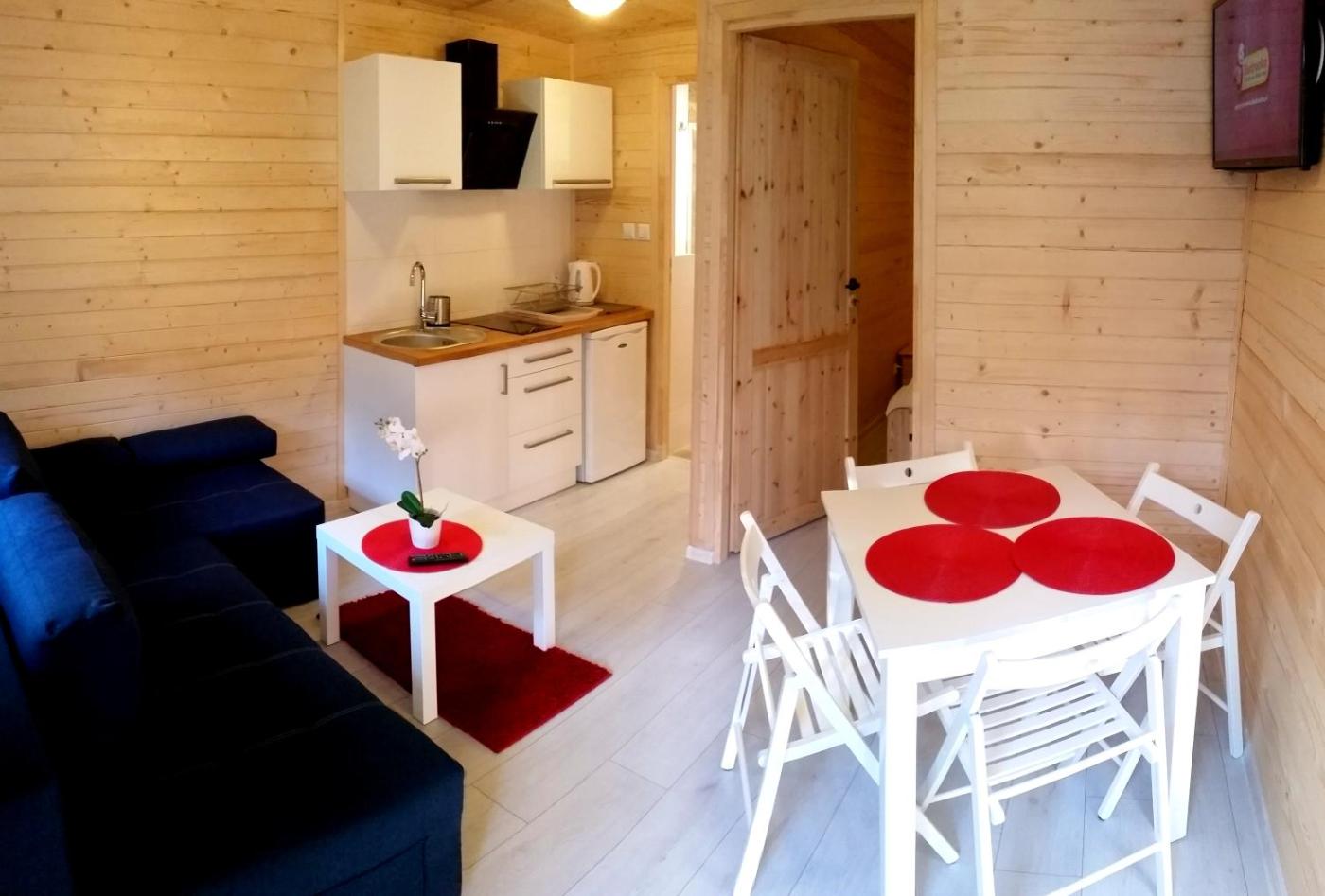 Domek z 1 sypialnią. This chalet is comprised of 1 living room, 1 separate bedroom and 1 bathroom with a shower. Guests will find a stovetop, a refrigerator and kitchenware in the kitchenette. The chalet also has a barbecue. Featuring a terrace with garden views, this chalet also offers an electric kettle and a flat-screen TV. The unit offers 2 beds. Domek - 5 osobowy. Powierzchnia pokoju ok.: 25 mkw. ;